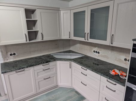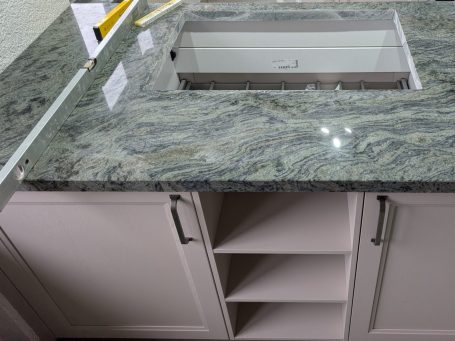 Der krönende Abschluss des Küchenprojekts bildet eine Abdeckung aus poliertem Granit der Sorte Verde San Francisco.